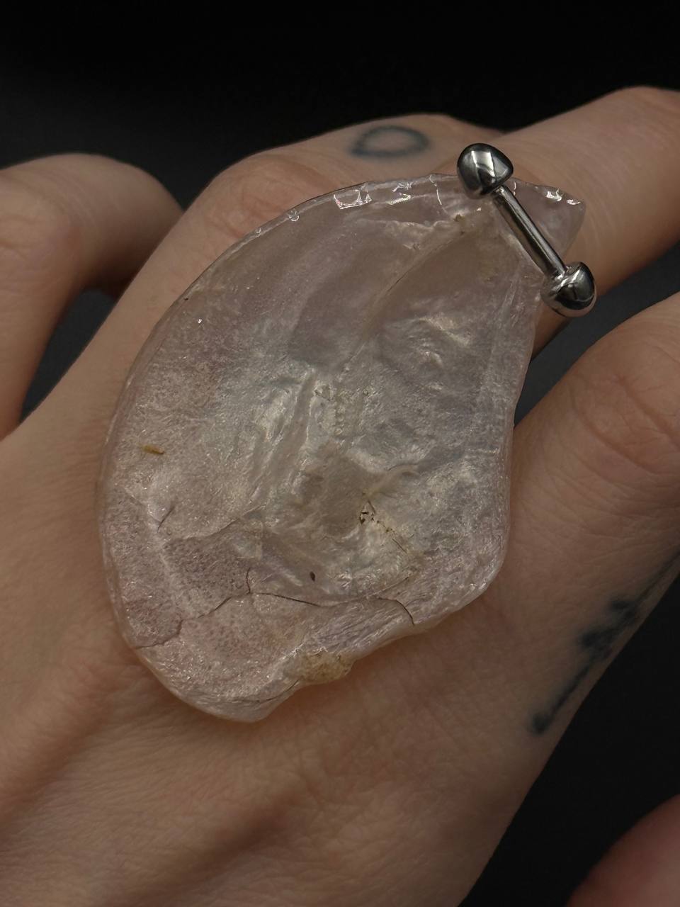 Я аккуратно поместила нежную пленку в специальную форму и залила ее эпоксидной смолой. Этот материал не желтеет со временем и надежно защищает хрупкую структуру эпифрагмы от влаги, пыли и механических повреждений. Он как бы замораживает природную красоту, делая ее частью нашего мира. Добавив изящную фурнитуру, я получила уникальное кольцо.
